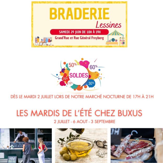 A la veille des vacances, nous tenons à vous rappeler quelques événements qui auront lieu cet été. Tout d’abord, la braderie de Lessines se tiendra le samedi 29/06 de 10h à 18h. Ce sera l’occasion pour vous de profiter avant les soldes de ristournes exceptionnelles: 40% sur les vêtements, 30% sur la maroquinerie… Y compris…