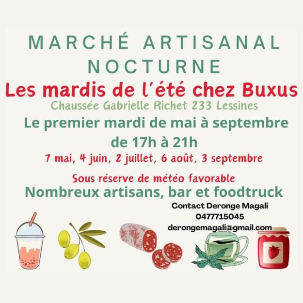 Lors du dernier marché artisanal, Magali, créatrice des délicieux thés TEALOU, m’a partagé son idée d’organiser des nocturnes (5 MARDIS de 17h à 21h) pendant l’été chez Buxus… Son enthousiasme communicatif m’a littéralement convaincue!!! Ainsi, l’idée est née et Magali s’est chargée de la concrétiser… Elle n’a pas fait les choses à moitié… On attend…